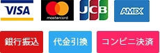 クレジットカード (VISA / MASTERCARD / AMEX / JCB)、銀行振込(先払い)、郵便振替(先払い)、代金引換からお選びください。